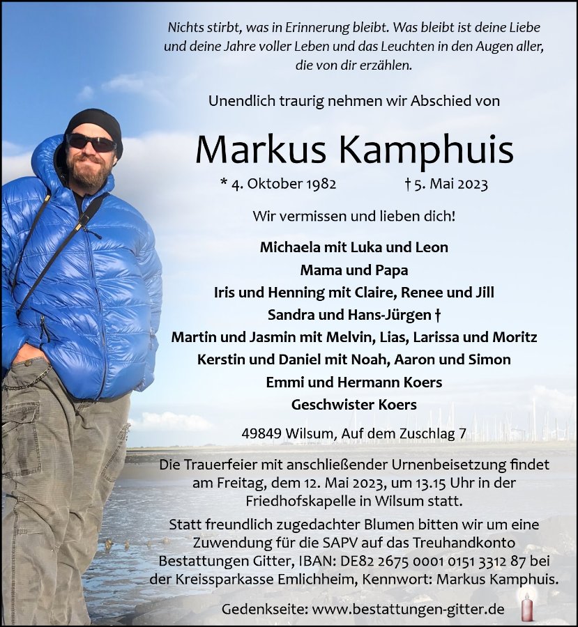 Jeder Tag zieht sich zäh durch die Zeit, jeder Tag ist eine neue Herausforderung, die ich jetzt ohne dich schaffen muss. Jeden Tag weint mein Herz und meine Seele sehnt sich nach deiner wärmenden Nähe, deinen positiven Ratschlägen, deinen lustigen Sprüchen, deinem Maurer-Slang, deinem neckischen Ärgern, deiner fröhlichen, durchgeknallten Art, deinen Umarmungen, dein flauschiges Brusthaar, deine Hand zu halten, mit dir am Feuer sitzen, mit dir zur Nordsee fahren oder einfach nur zum Teich, neben dir einzuschlafen und aufzuwachen.